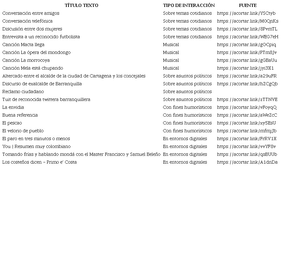 Para esta investigación se estructuró un corpus de veinte textos de diversa naturaleza que se agruparon en cinco tipos de interacciones: interacciones sobre temas cotidianos, interacciones musicales, interacciones sobre asuntos políticos, interacciones con fines humorísticos e interacciones en entornos digitales. Los textos se seleccionaron teniendo en cuenta dos criterios: ser textos producidos por personas del Caribe colombiano y contener enunciados obscenos. Estos se tomaron de diversas plataformas digitales como Facebook, WhatsApp, Twitter y YouTube. Lo anterior, atendiendo a la facilidad de acceso a la diversidad de manifestaciones discursivas propias del mundo digital y también a la posibilidad de controlar los tipos de interacciones, de tal forma que se pudiera mostrar la mayor variedad posible en las mismas. Es necesario anotar que, aunque los textos se tomaron de fuentes digitales, la mayor parte de estos corresponden a manifestaciones espontáneas, es decir, que se originaron en y para un contexto de interacción real, no para el digital. En el análisis de las fuentes originadas para el entorno digital, se tuvo en cuenta dicha intención.