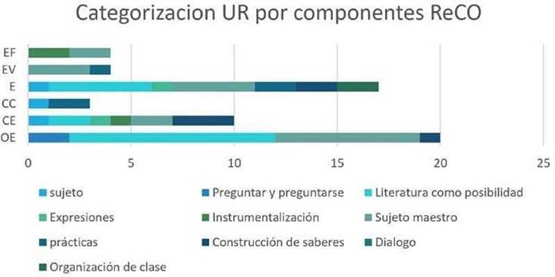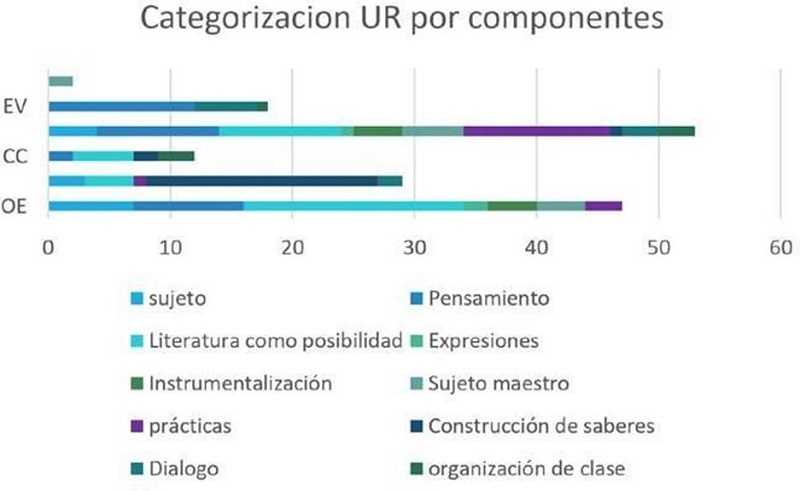 El componente de OE presenta la literatura como posibilidad de encuentro con las infancias con una frecuencia de 18 UR. Las OE de la maestra se establecen en el objetivo de comprender la literatura como una manera de asumirla en la vida y como un componente clave en la formación de maestros. La profesora expresa y da cuenta que «todos los maestros de educación infantil necesitan estos saberes, pero más que el mismo saber, necesitan estar atravesados por la literatura». Lo que revela que el hacer de la profesora se centra en la formación de literatura infantil más allá de una herramienta o una estrategia para el aprendizaje, puesto que se concibe como aquella que emerge en la experiencia misma del sujeto, como un ejercicio de sí que da lugar a repensarse y asumirse desde las esferas de la posibilidad y el encuentro.