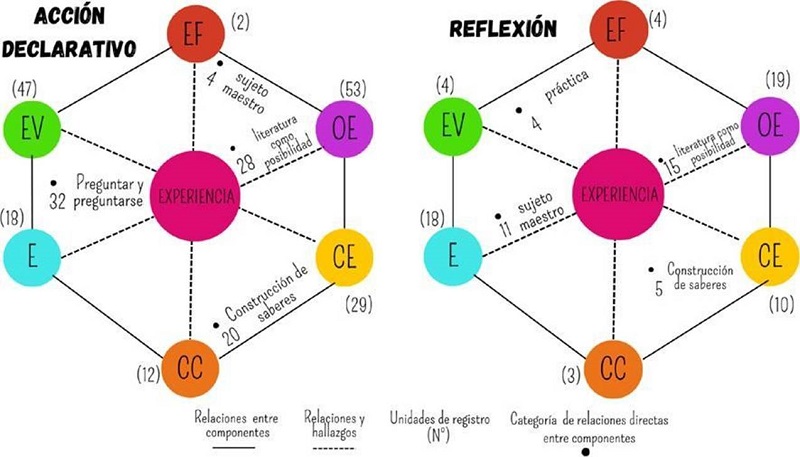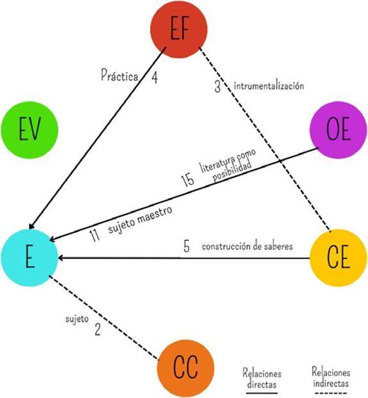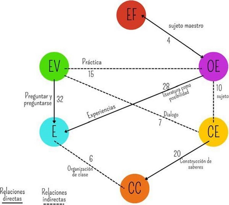 Las relaciones de los componentes de EV y CE se presentan en el continuo preguntar y preguntarse. La pregunta conduce a las estudiantes a pensarse más allá de lo dicho, se determina como posibilitadora de conexiones y construcciones que permiten una relación directa con la literatura, concebida como una posibilidad de encuentro y descubrimiento. Otra relación que se puede determinar es entre OE y CE dado que la maestra construye una visión y manera de relacionarse con la literatura, identificando en esta un modo de vida que emerge en la experiencia como aquella intensidad del amor hacia la literatura ya que «educar en literatura es aprender, amar en la literatura [dado que] es muy diferente cuando enseñamos a amar la literatura por el solo gusto de leer» (TCUR72). Un gusto que se ve reflejado en el sujeto, es sus maneras de ver y apreciar al otro y al mundo en sus formas de relacionarse y encontrar sentidos, significados e inquietudes que le posibilitan ir transformando sus pensamientos y para generar nuevas construcciones.