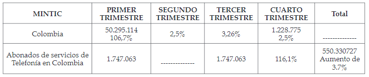 En el 2013, el informe registrado por el Ministerio de Tecnologías de la Información y las Comunicaciones (MINTIC) en su boletín trimestral, muestra que el número de abonados en Colombia era de 50.295.114, existiendo en el país 106,7% abonados en servicios por cada 100 habitantes. Lo anterior, evidencia una variación entre el 2012 y 2013, marcada por un aumento porcentual del 2,5%, representado por 1.228.755 habitantes. Al finalizar el cuarto trimestre del 2013, la participación en el mercado de telefonía móvil en Colombia tuvo un giro en distribución, de acuerdo a sus proveedores y la implementación de nuevas marcas. (Ministerio de tecnologías de la información y las comunicaciones 2014). Finalmente, en el cuarto trimestre del 2014 el número de abonados en servicio de telefonía móvil en Colombia alcanzó un total de 55.330.727 de personas, presentando un aumento de 3.7% en el índice de penetración con relación al trimestre anterior, el cual se ubicó en el 116,1% al finalizar el año. En otras palabras, la variación porcentual de abonados en servicio de telefonía móvil al término del cuarto trimestre de 2014, es de 3,26% respecto al tercer trimestre 2014, presentando un crecimiento en valores absolutos de 1.747.063 abonados en servicio de telefonía móvil. (Ministerio de tecnología de la información y las comunicaciones 2015). Tal como lo afirma Said, E. (2012).