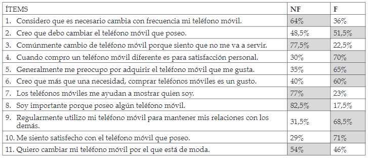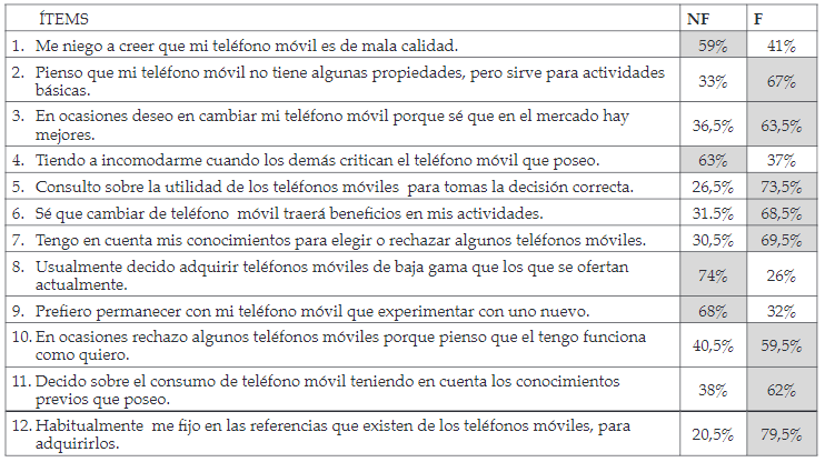 Finalmente, el análisis de la subescala de Incongruencia con las actitudes presenta un análisis de los resultados obtenidos permite determinar que el 79,5% de los estudiantes se fijan en las referencias que existen de los teléfonos móviles para adquirirlos; 73,5% consulta sobre la utilidad de los teléfonos móviles para tomar la decisión correcta; 69,5% tienen en cuenta los conocimientos para elegir o rechazar algún teléfono móvil; un 68,5% creen que cambiar de teléfonos móviles traerá beneficio en sus actividades; el 67% piensan que sus teléfonos móviles no tienen algunas propiedades pero sirven para actividades básicas; el 63,5% en ocasiones desean cambiar su teléfono móvil porque saben que en el mercado hay mejores; y finalmente el 59,5% de la población rechazan en ocasiones algunos teléfonos móviles porque piensan que el que tienen funciona como quieren.