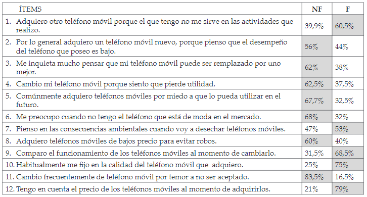 En términos estadísticos se manifestó que el 79% de la población tiene en cuenta el precio de los teléfonos móviles al momento de adquirirlos; un 75% se fija en la calidad del teléfono móvil que adquiere; el 68,5% compara el funcionamiento de los teléfonos móviles al momento de cambiarlos; un 60,5% adquiere un teléfono móvil porque el que tiene no le sirve para las actividades que realiza; y finalmente el 53% de la población piensa en las consecuencias ambientales al momento de desechar un teléfono móvil. El análisis de los componentes se representa en la tabla 3.