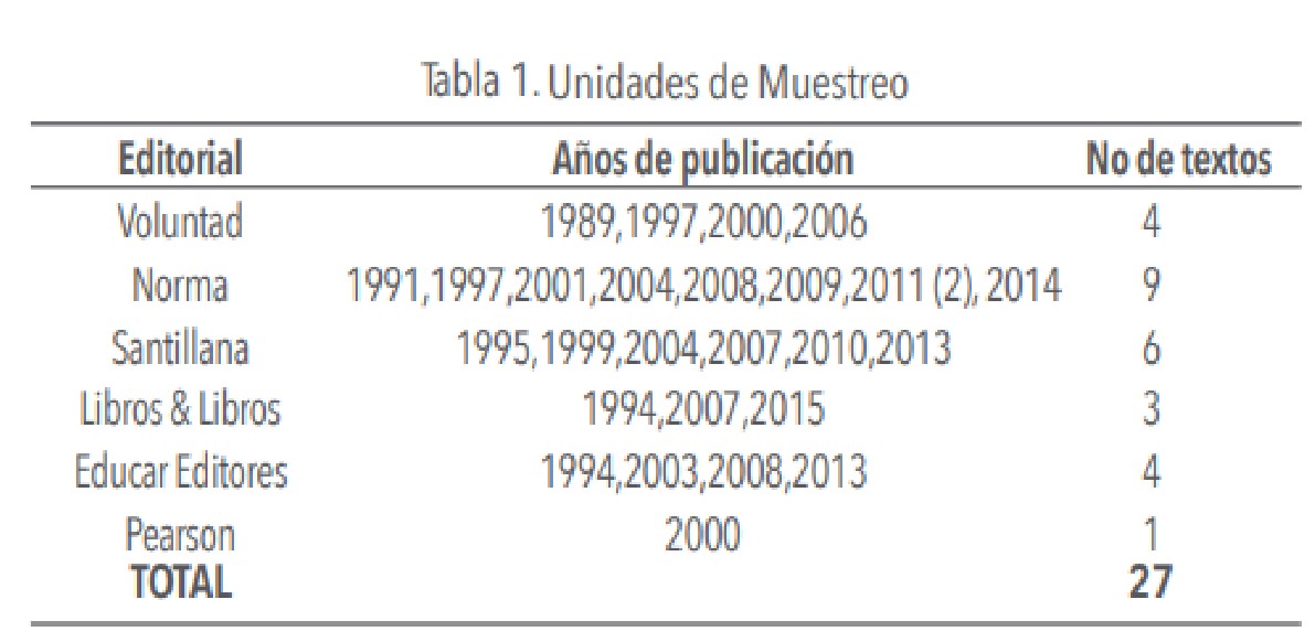 Esta investigación se fundamentó metodológicamente en el análisis de contenido de tipo cualitativo descrito por Krippendorff (1990), perspectiva desde la cual a partir de ciertos datos se pueden establecer inferencias reproductibles y válidas sobre el objeto que se está analizando. Así pues, se trabajó sobre contenidos implícitos o latentes en torno a los discursos escritos y visuales desde los cuales 27 textos escolares de ciencias sociales publicados en Colombia a partir de 1989 hasta 2016 (ver tabla 1), definen y estructuran sus explicaciones históricas acerca del periodo de “La Violencia”. Las unidades de muestreo -textos escolares- fueron seleccionadas de publicaciones dirigidas al grado noveno de la educación básica secundaria, ya que, a partir de la expedición del MGCS en este nivel, comenzó curricularmente a ser abordado el tema del periodo de “La Violencia” como contenido escolar a ser enseñado. Sumado a este criterio central, la selección definitiva de la muestra, obedeció a los siguientes principios: la circulación de los textos en todo el territorio Colombiano; el reconocimiento de las casas editoriales por parte de la comunidad educativa y académica; y, el número de ejemplares impresos.