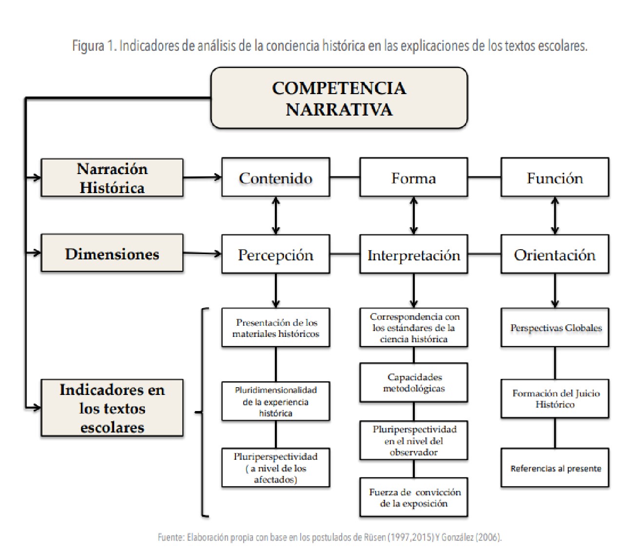 Para efectos del desarrollo del presente artículo y debido a su centralidad en la investigación planteada, se tomarán como referentes expositivos, la discusión y resultados derivados del núcleo de análisis número 4. Éste se estructuró a partir de indicadores asociados a lo que Rüsen (1997, 2015) denomina competencia narrativa, elemento central en el desarrollo de la conciencia histórica, el cual permite identificar y entender el proceso mediante el cual se “(…) sintetizan las experiencias del pasado con los criterios de sentido que son efectivos en la vida práctica contemporánea y en las perspectivas de orientación de acción en dirección del futuro” (Rüsen, 2012, p. 523).