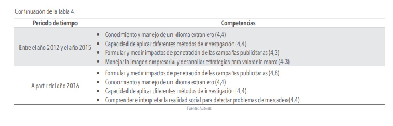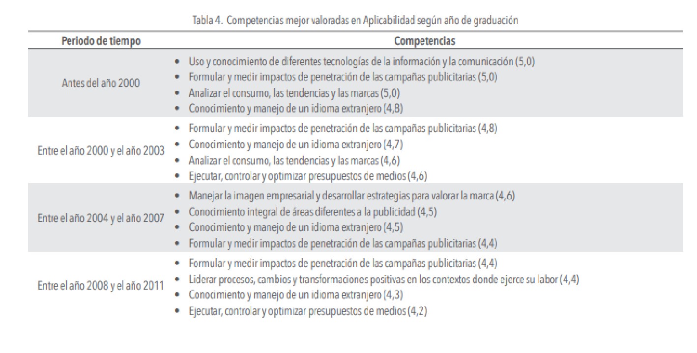 La investigación también tuvo en cuenta el año de egreso de los profesionales en publicidad, debido a que, como se mencionó anteriormente, las competencias profesionales se actualizan y cambian constantemente, razón por la cual se hace necesario saber si los publicistas se están adaptando a las nuevas competencias del mercado o, por el contrario, están más reacios a concebir los cambios y siguen dando una mejor valoración a las competencias que predominaban en el año de su graduación. A continuación, se puede observar la tabla, de las 4 competencias mejor valoradas por cada periodo de tiempo en el que se graduaron los publicistas y sus respectivas valoraciones.