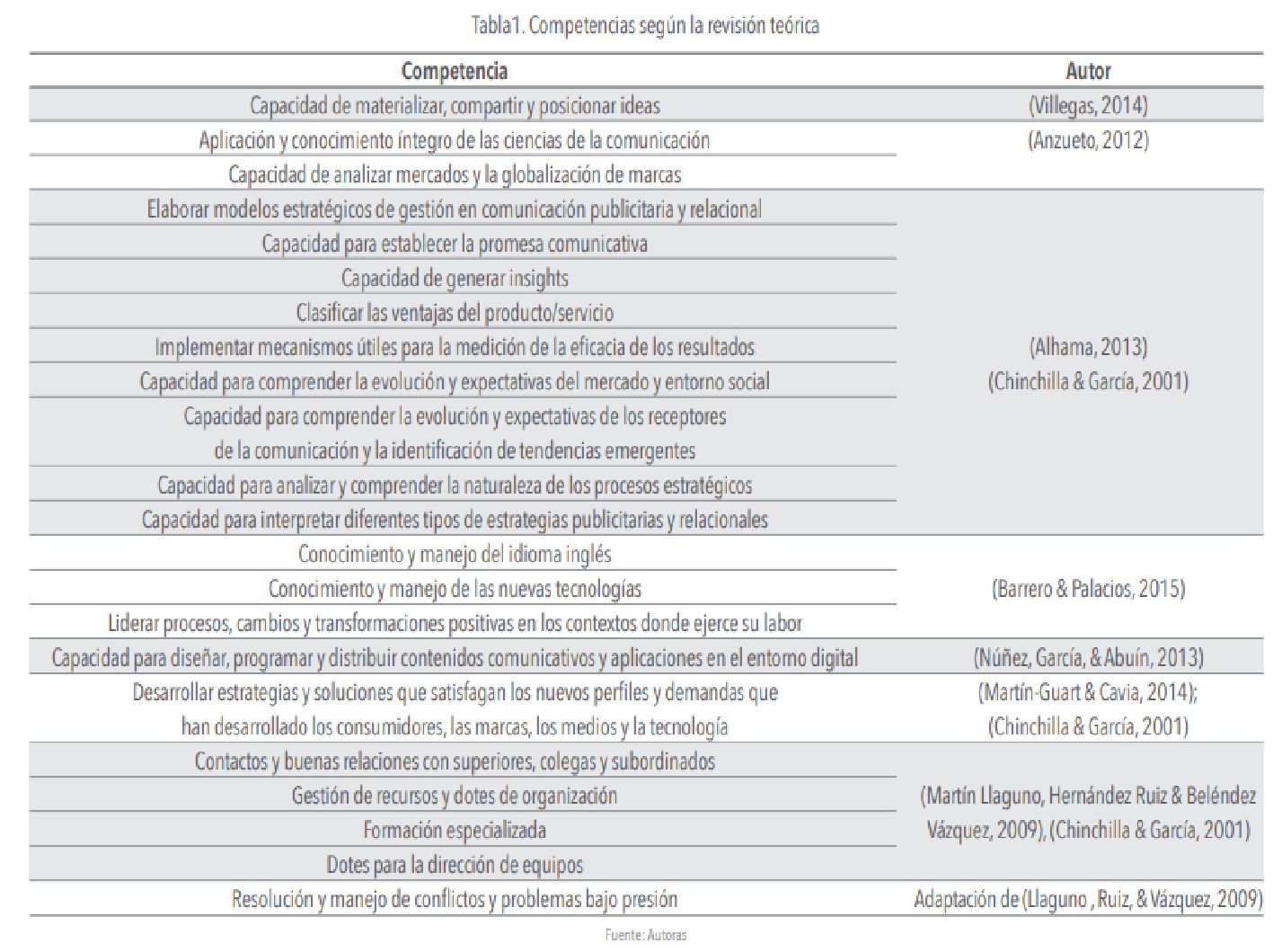 De otro lado, un estudio realizado en la Comunidad Autónoma Vasca respecto a cómo los publicitas valoran las competencias en su desempeño laboral y las intenciones de formación en los siguientes 5 años encontró que la creatividad y la planificación estratégica constituyen las competencias más valoradas por los profesionales, así como las relacionadas con “el marketing digital, las habilidades comerciales, las habilidades directivas, el conocimiento de los medios de comunicación, el diseño gráfico y la redacción publicitaria” (Monge Benito & Etxebarria Gangoiti, 2017, p. 97).