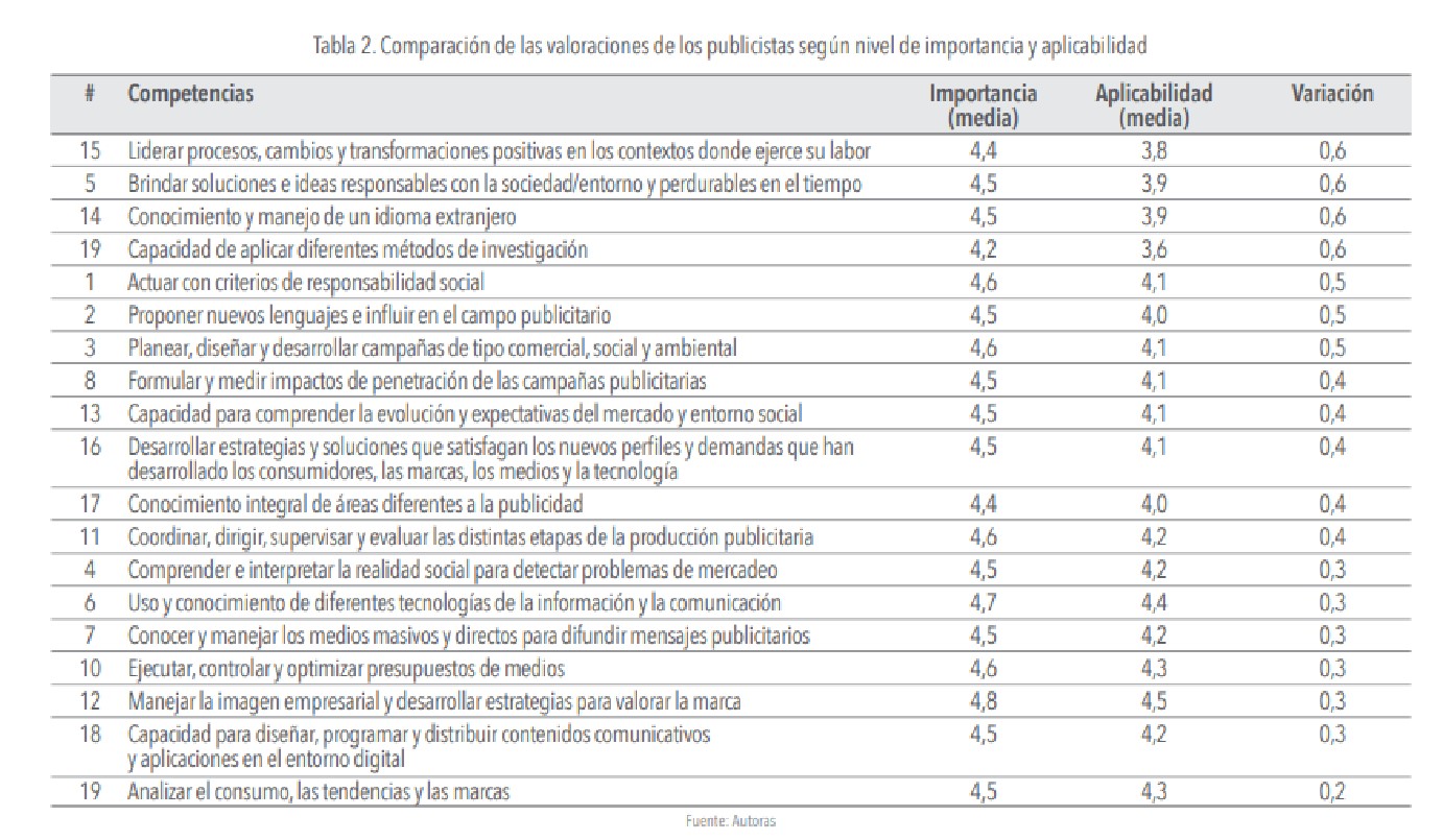 La tabla muestra las competencias, su media y su grado de variación en mayor y menor medida en cuanto a importancia y aplicabilidad según la opinión de los publicistas que participaron en la consulta.