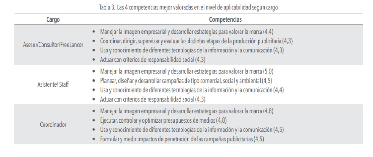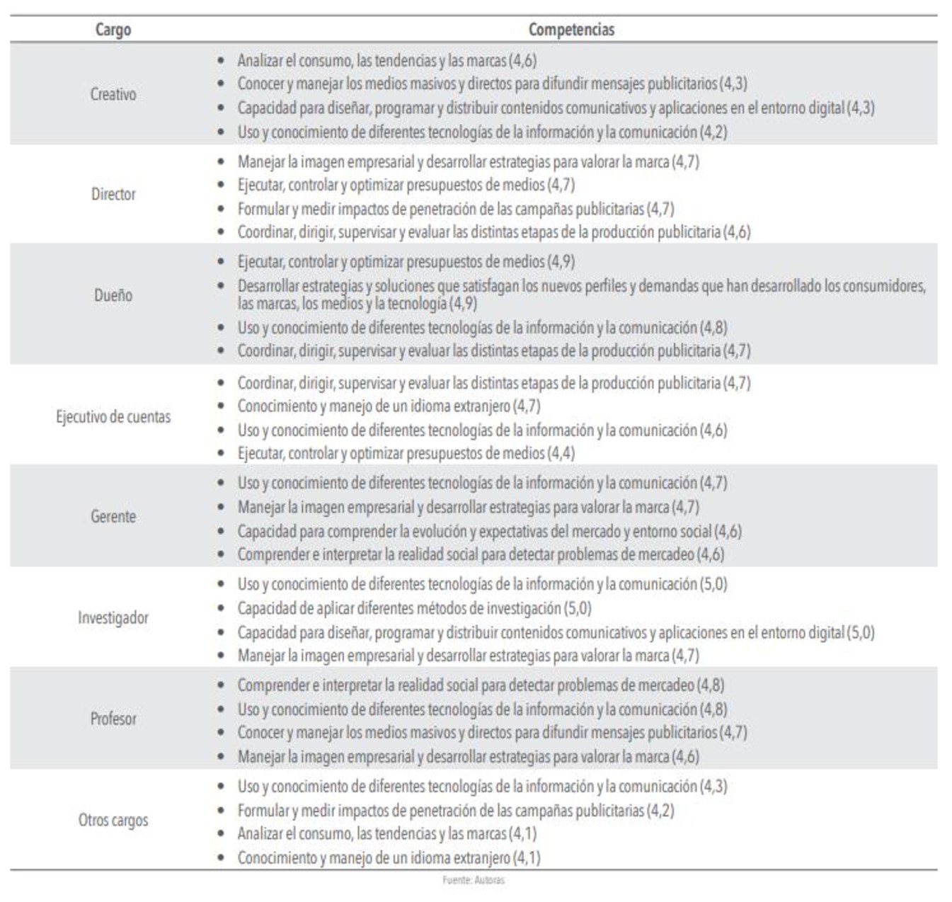 Por lo tanto, se puede decir que, para cada uno de los cargos que los profesionales en publicidad desempeñan existe un grupo de competencias que requiere demostrar con mayor afianzamiento. A pesar de que todas las competencias se mantienen en una valoración que demuestra su alta importancia y aplicabilidad, se puede encontrar que aún la competencia mejor valorada por el promedio general, su perspectiva y valoración puede cambiar dependiendo del cargo y las funciones que tenga que realizar el profesional.