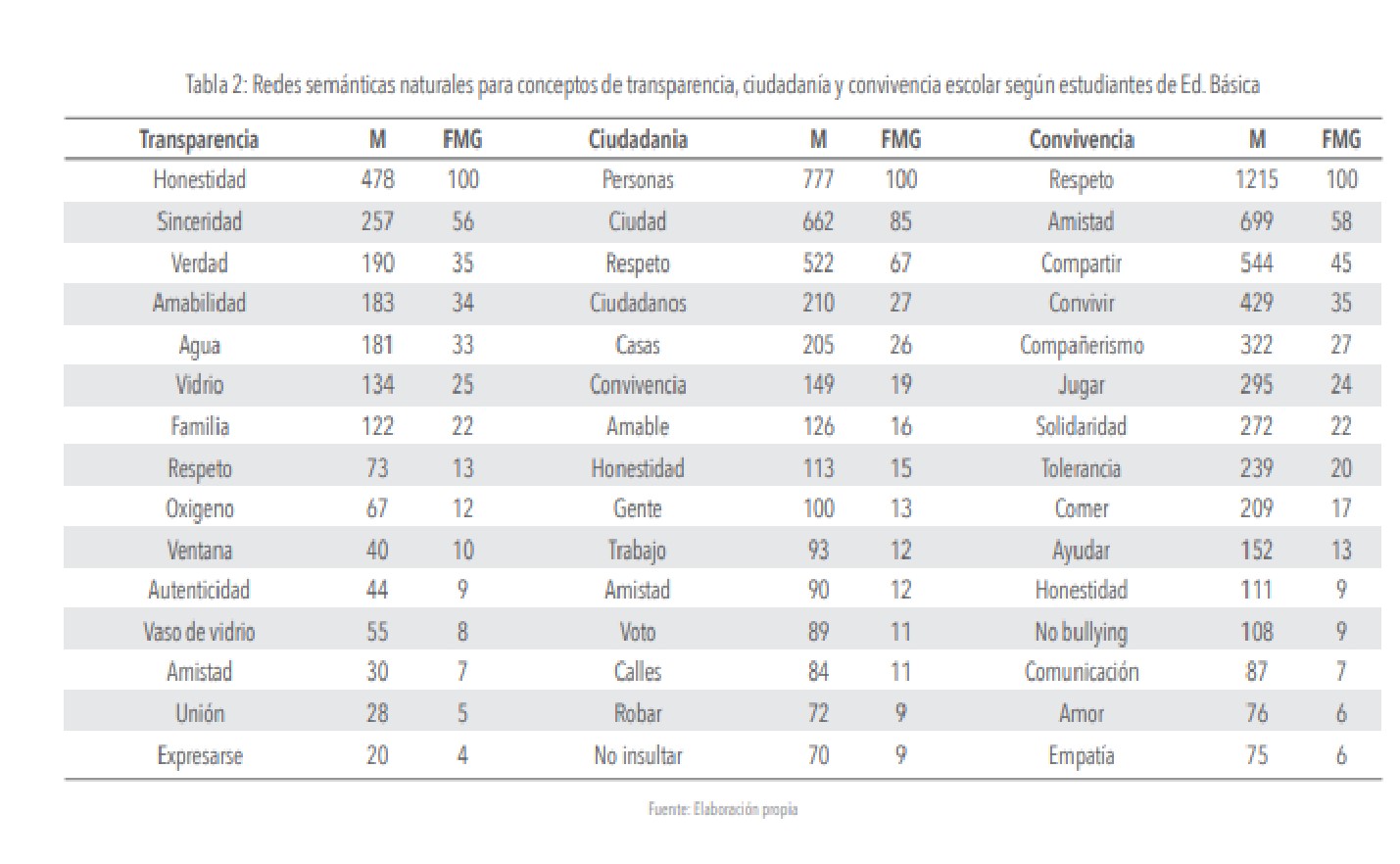 Para acceder a las percepciones de los participantes respecto de convivencia escolar, ciudadanía y transparencia, se utilizó la técnica de Redes Semánticas Naturales que permite la evaluación del significado, el que a su vez está “dado por un proceso reconstructivo de información en la memoria, que permite observar cual es el conocimiento que se tiene de un concepto” (Valdez, 1998:60). Esta técnica permite a los participantes toda la libertad para generar o plantear los conceptos que deseen o crean que están relacionados o que definan al concepto central.