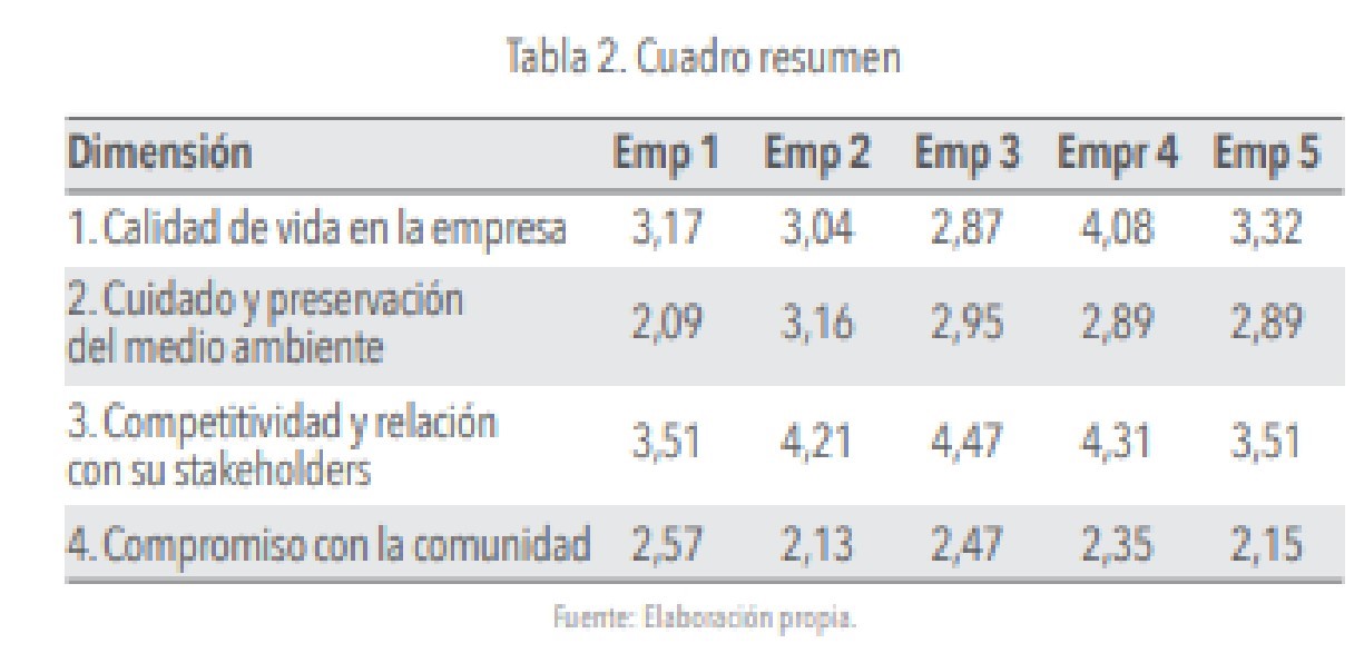 De acuerdo con la tabla N° 2, la dimensión Competitividad y relación con sus Stakeholders, es la que presentó el mejor desempeño (4,01 puntos), destacándose las empresas 3 y 4, con desempeños de 4,47 y 3,31 puntos respectivamente, las prácticas que dan cuenta de ello son las siguientes: presenta políticas de trato a sus clientes que garanticen la honradez de sus transacciones, poseen políticas de cumplimiento de obligaciones y compromiso con terceros, cuentan con programas de apoyo para el desarrollo de sus proveedores, desarrollan mensajes promocionales y publicitarios objetivos y honestos y cumple a tiempo con sus obligaciones fiscales. En la dimensión de Calidad de vida en la empresa (3,30 puntos), la empresa 4 es la que presentó el mejor desempeño (4,08 puntos), debido a que posee políticas de no discriminación, gestiona liquidaciones y despidos de forma digna, fomenta el trabajo en equipos, escucha sugerencias, ideas y reclamos de sus empleados. En cambio, en la dimensión Cuidado y Preservación del Medio Ambiente, calificó con 2,80 puntos, la más deficiente es la empresa 1, con desempeño 2,09 puntos, las prácticas deficientes son: adquiere productos y materia prima reciclables minimizando el uso de materiales no degradables, realiza acciones promoviendo entre sus empleados conciencia ambiental, dona excedentes mobiliario y equipos para su realización y opera sistemas necesarios que disminuyan las emisiones contaminantes. Finalmente, la dimensión con menor desempeño fue Compromiso en la Comunidad (2,34 puntos), las empresas 2 con desempeño 2,13 puntos y la empresa 5 con desempaño 2,15 puntos, presentan las mayores debilidades en: otorgar donativos en efectivo de la menos el 1%, destinar al menos el 2% del presupuesto de su publicidad a mensajes con interés o beneficio social, y contribuir a la promoción del bienestar económico y social de las comunidades.