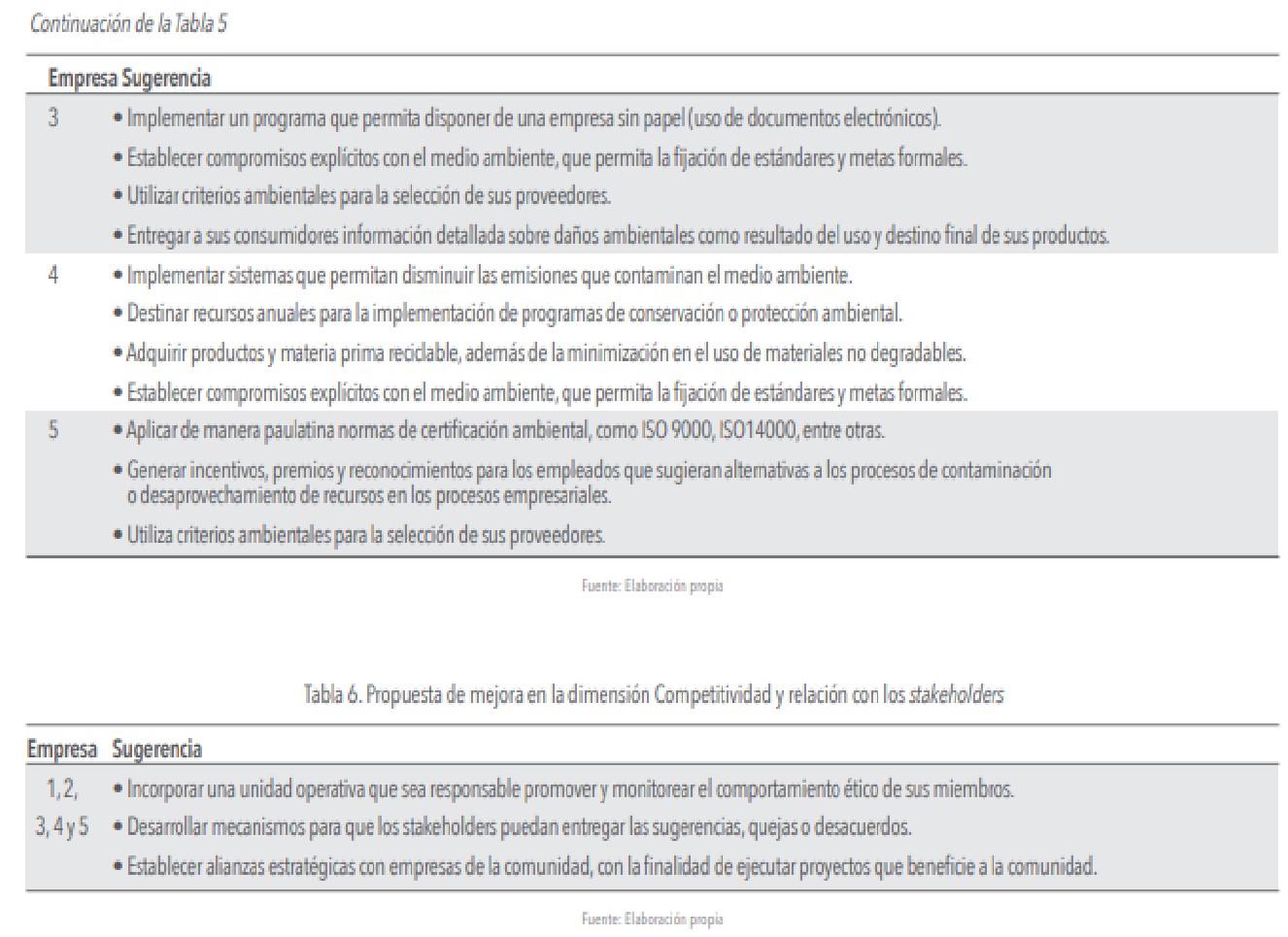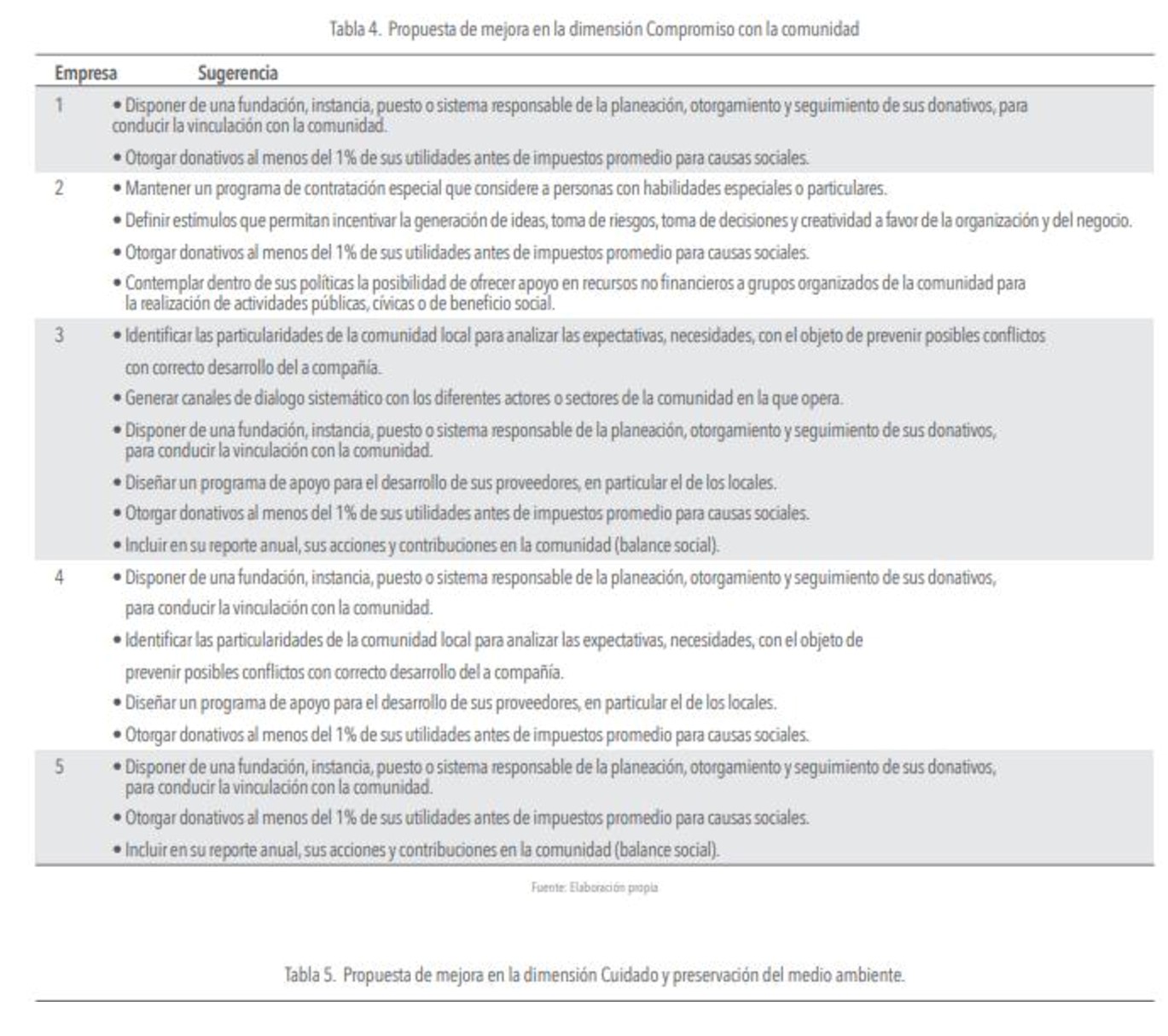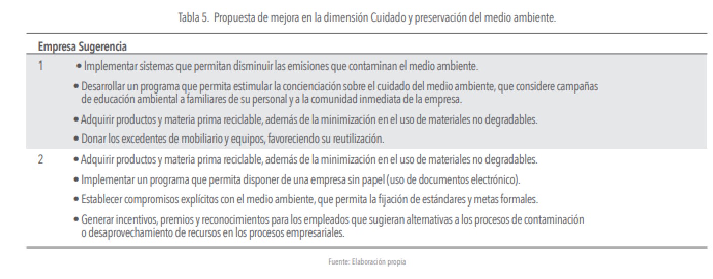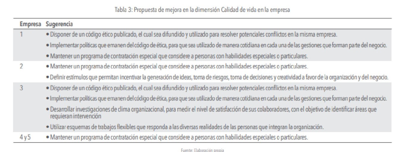 A continuación, se presenta en tabla 3, 4, 5 y 6, un conjunto de propuestas de mejoras, que responden a los aspectos negativos en relación a las prácticas que forman parte de las dimensiones de la responsabilidad social empresarial. Cabe señalar que se debe considerar el alineamiento de estas propuestas con las orientaciones estratégicas particular de cada una de las compañías.