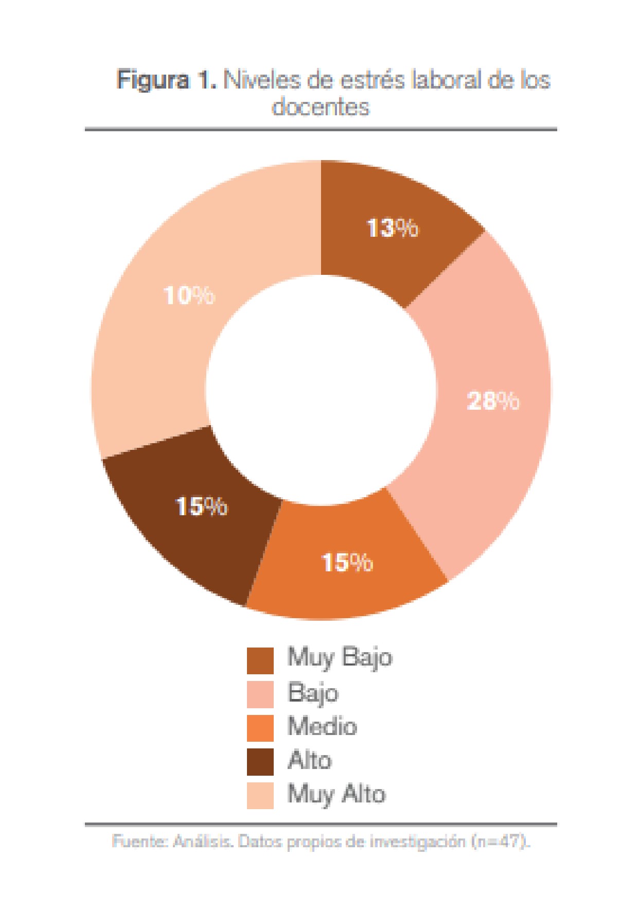La Figura 1 muestra que el 45% de la población presenta niveles de estrés entre alto y muy Alto, el 40% se encuentran con niveles muy bajo y bajo y 15% con un estrés medio. Significa que el bienestar laboral de buena parte de los docentes se ve alterado por respuestas de estrés fisiológicas, cognitivas, afectivas, sociales y emocionales. Este hallazgo implica la urgencia, a nivel institucional, de realizar el proceso de evaluación y vigilancia sobre el riesgo psicosocial, según lo determina la Resolución 2646 de 2008.