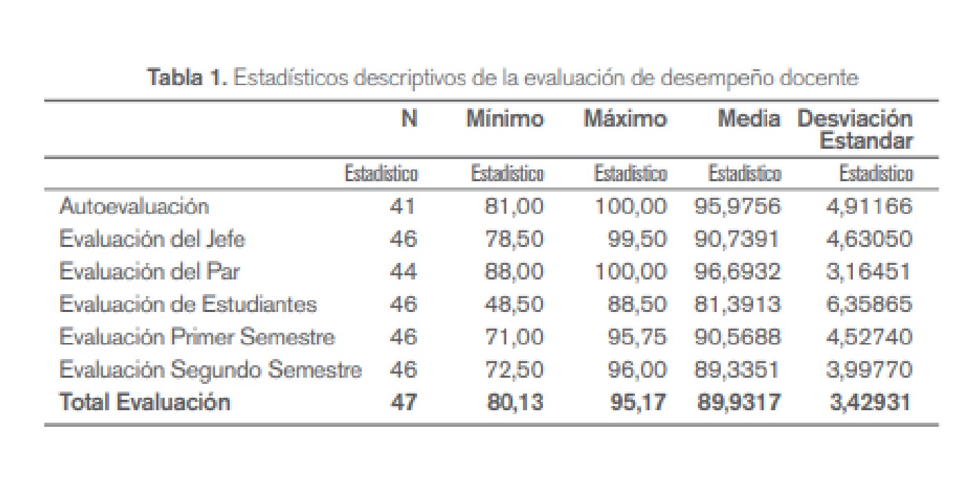 Cabe aclarar que el tamaño de la muestra y el hecho de que pertenece solamente a una de las varas instituciones de educación superior de la región, limita la posibilidad de extrapolar los resultados y de poder comparar entre instituciones públicas y privadas, que como se vio en la investigación de Tahir (2011). De igual forma, sobre los instrumentos de evaluación docente, aunque presentan validez de contenido al ser diseñados por expertos en recursos humanos de la institución universitaria, no se tiene medición que corrobore su confiabilidad y validez. Más aún, la baja desviación estándar de varios de ellos puede haber influido en los resultados de los estadísticos aplicados.
