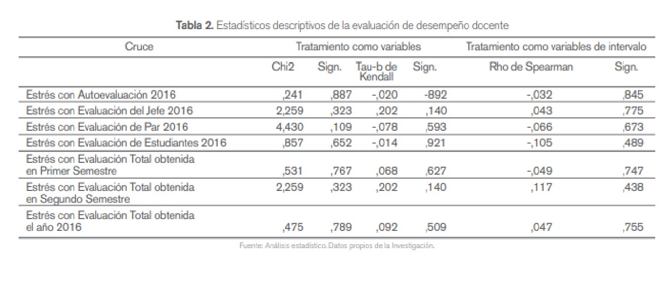 La Tabla 2 resume los resultados de las correlaciones estadísticas entre el Cuestionario de Estrés Laboral y los resultados de Evaluación Docente del año 2016. En general no se encontró ninguna asociación significativa estadísticamente hablando. Este hallazgo sucede a pesar de que en primera medida se usó el concepto de tablas cruzadas y la comparación de frecuencia esperada y observada, mediante Chi2; y también se hizo el ejercicio de asociar los puntajes en escala cuantitativa de intervalo, es decir, la calificación bruta del cuestionario de estrés y los puntajes del desempeño laboral. Por tanto, al mantenerse la hipótesis nula, se encuentra que el nivel de desempeño medido no predice el nivel de estrés de los docentes en la universidad.