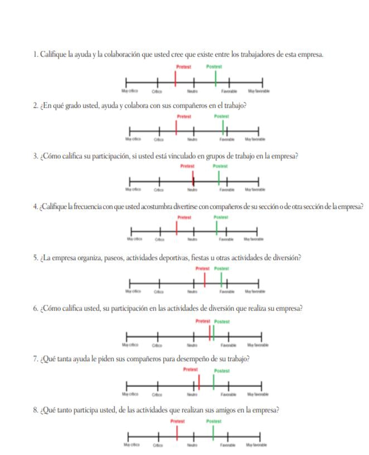 Con los recursos que se contaba para la investigación, las dimensiones más apropiadas a impactar del IMCOC eran cooperación y relaciones interpersonales ya que no se requería de ningún factor externo al mismo relacionamiento de los trabajadores. Se pudo establecer con claridad que la escogencia de estas dimensiones fue adecuada, así lo confirman las encuestas donde el postest del grupo experimental fue superior en cada uno de los reactivos al pretest.