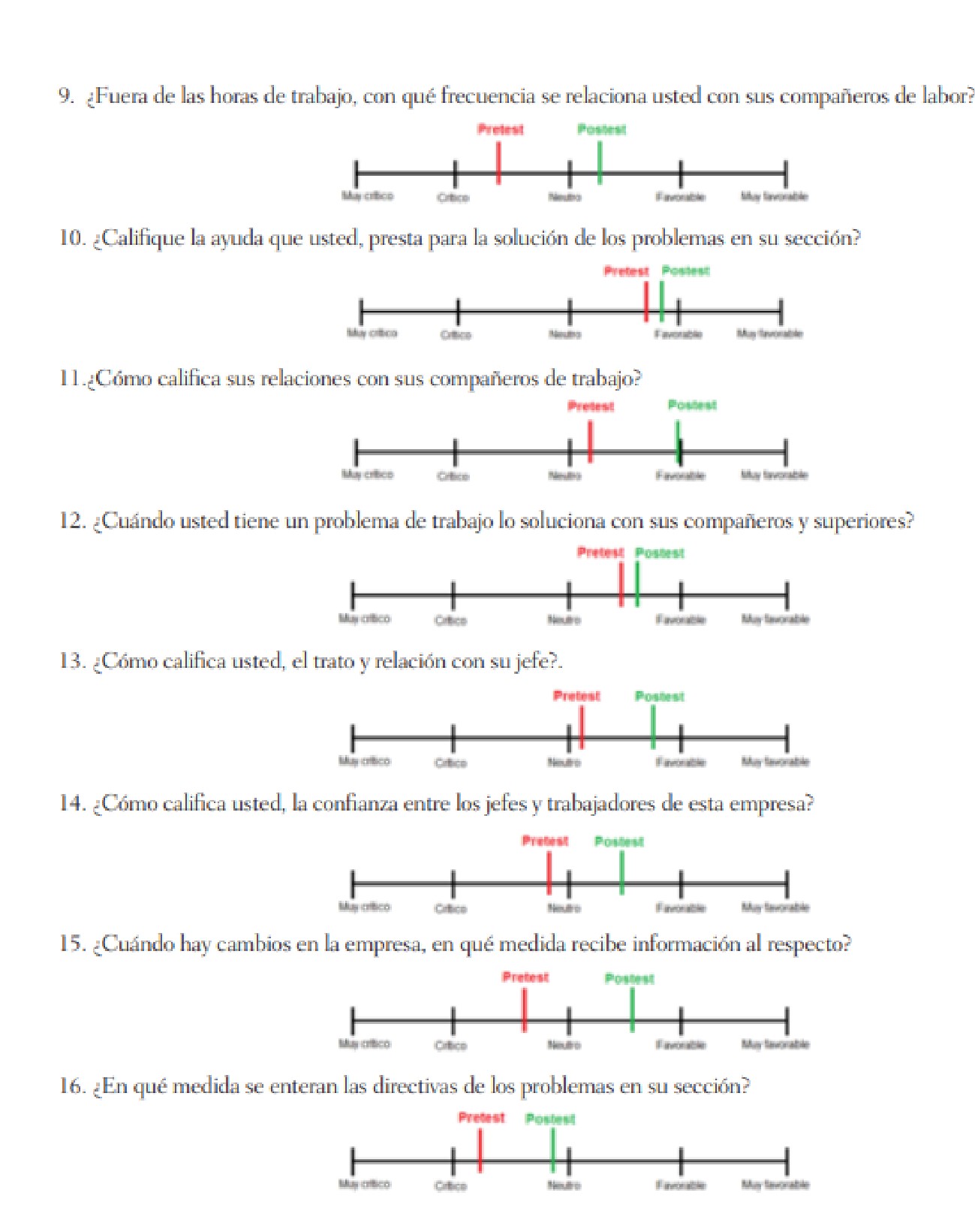 Al realizar el análisis del grupo intacto de control se observó que no hay mejora significativa entre el pretest y el postest y que el 50% de los ítems de la encuesta mostró una disminución en su medición. Esto pudo haberse dado gracias a cambios internos que se han generado en el último año al interior de la organización.Este resultado afirma la necesidad de intervenir a los trabajadores con formación que mejore el relacionamiento y el trabajo en equipo. Citando a el padre del management Peter Drucker (1995) “Solo tres cosas ocurren de manera natural en las organizaciones: la fricción, la confusión y el bajo rendimiento. En todo lo demás hace falta Liderazgo”. No se puede entonces esperar a que el clima laboral mejore por sí mismo, ya que la tendencia es a desmejorar y a que los conflictos y la falta de comunicación se agudicen.