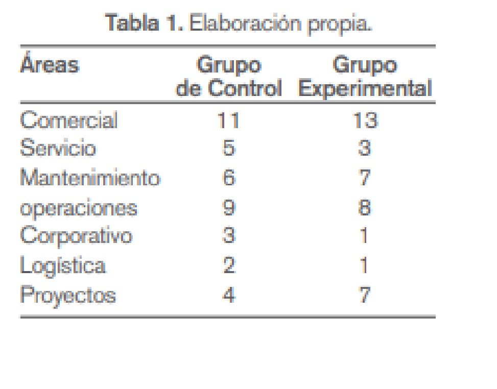 El cuestionario se aplicó a 80 trabajadores directos de la empresa Claro Colombia con sede en la ciudad de Medellín, 40 del grupo de control los cuales fueron escogidos al azar y 40 del grupo experimental a los cuales se les invitó y accedieron voluntariamente a participar de los talleres. Los trabajadores pertenecen a las áreas de proyectos, comercial, servicio, mantenimiento, operaciones, logística y corporativo cómo muestra la tabla 1.