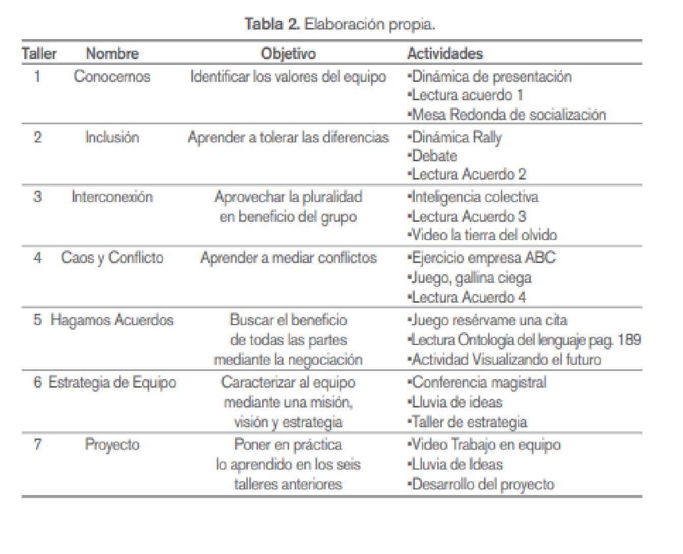 El contenido de los talleres se presenta de manera resumida en la tabla 2.