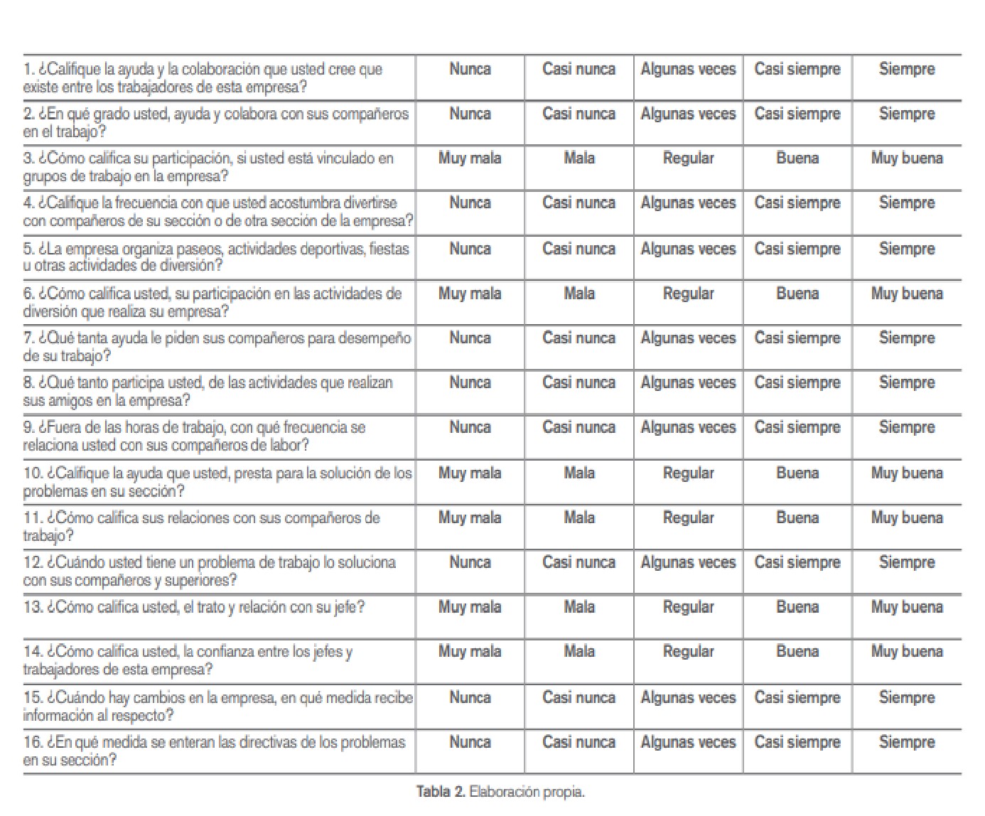 Las preguntas que se realizaron fueron en total 16 de las cuales las primeras 10 corresponden a la dimensión de cooperación y las 6 restantes a Relaciones Interpersonales.