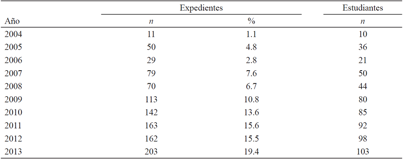 Al igual que con la cantidad de expedientes, la cantidad de estudiantes también aumentó con los años (tabla 1). Durante el año de apertura del CAP, se contabilizó la atención por parte de diez estudiantes, mientras que para el año 2013 la cantidad de estudiantes llegó a 103, lo que representa un aumento del 930%. Lo común fue que las y los estudiantes atendieran uno (40.9%) o dos (24.6%) casos, aunque hubo algunas pocas personas que atendieron hasta ocho o nueve. En cuanto a docentes, se contabilizó un total de nueve docentes titulares de los cursos y de 31 docentes que supervisaron los casos a través de los diez años en estudio.