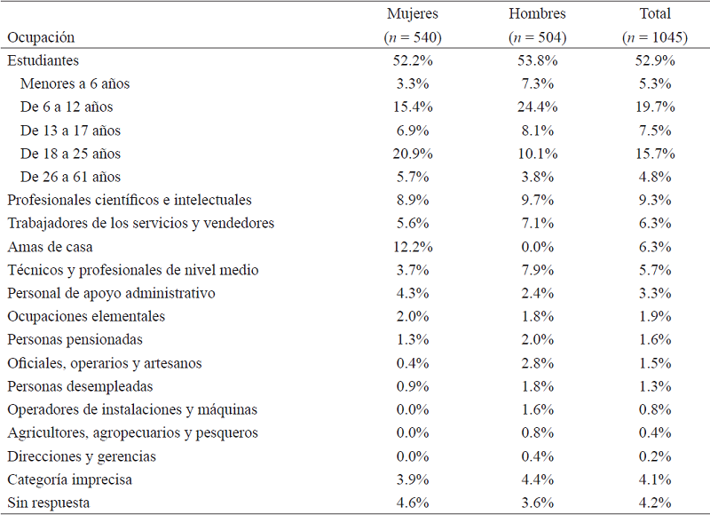 Se observaron algunas diferencias de ocupación según el sexo. Dentro de los expedientes de mujeres, hubo 12.2% correspondientes a la ocupación “ama de casa”, mientras que esta categoría no se presentó en el caso de los hombres. Por el contrario, en la categoría de “técnicos y profesionales de nivel medio” los casos correspondientes a hombres (7.9%) fueron más del doble de los de mujeres (3.7%). En cuanto a los grupos etarios de estudiantes, aquellos en adultez joven fueron más del doble en el caso de las mujeres (20.9%) que en el caso de los hombres (10.1%), mientras que aquellos en la infancia tuvieron mayor presencia en el caso de los hombres (24.4%) que en el grupo de mujeres (15.4%).