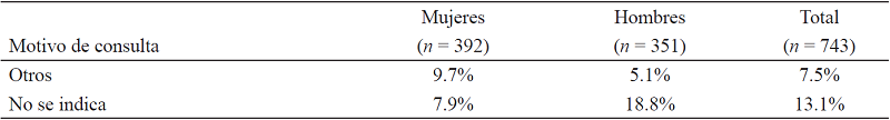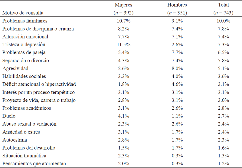 El motivo de consulta más común, entre hombres y mujeres, consiste en los problemas familiares.