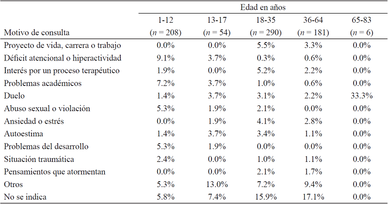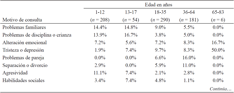 Por su parte, en el grupo de 36 a 64 años de edad, se evidencia cómo el motivo de consulta inicial se traslada del ámbito familiar al de pareja, porque los problemas de pareja aparecen como el primer motivo de consulta, seguido de separación o divorcio. Estos resultados son coincidentes con los datos de Barrera-Méndez et al. (2012) y López-Jaramillo et al. (2012), quienes también encontraron aspectos relativos a las relaciones de pareja como uno de los principales motivos entre la población adulta, que fue atendida en sus centros de atención psicológica.