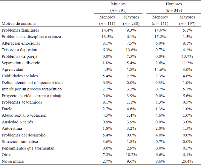 Las mujeres mayores de edad se diferenciaron, principalmente, por los motivos de consulta de tristeza o depresión (13.6%) y de “pensamientos que atormentan” (2.9%). En este grupo, los principales motivos de consulta fueron tristeza o depresión (13.6%), problemas familiares (9.3%), alteración emocional (7.5%), problemas de pareja (7.5%) y problemas de disciplina o crianza (6.1%).