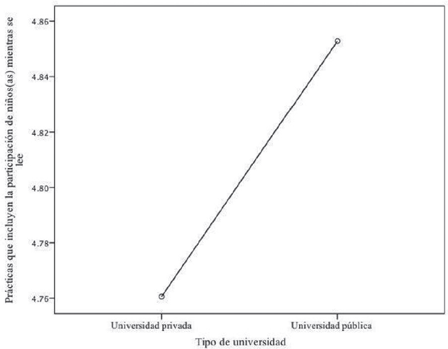 La primera dimensión evaluada se relaciona con las prácticas docentes, que incluyen a los niños cuando se está leyendo en el aula. Este componente incluye acciones que la docente ejecuta conjuntamente con el niño y evalúa puntualmente 1) si la docente se detiene en su lectura cuando encuentra nuevas palabras que pueda enseñar a los niños, 2) si señala con el dedo mientras va leyendo y 3) si inicia la lectura en la página izquierda. La muestra, en general, otorgó una importancia alta a estas prácticas, en tanto el promedio fue de 4.80 (DT=.60) en una escala de uno a cinco puntos. Se observó que las docentes, que obtuvieron su bachillerato en una universidad pública asignaron una mayor importancia (M=4.87, DT=.23) a estas prácticas que las docentes graduadas de universidades privadas (M=4.77, DT=.35), t (1,196.70)=10.37, p=.001). Este puntaje no difirió significativamente de acuerdo con la zona de procedencia de las docentes (urbano vs rural; t (1,262)=1.72, p=.191), o su obtención de un título de maestría o no (t (1,263)=.33, p=.856). Las diferencias entre docentes graduadas de universidades privadas y públicas se pueden observar en la figura 1.