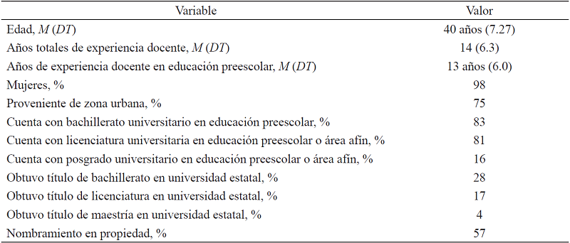 Como se observa en la tabla 1, las docentes que conformaron la muestra cuentan con una amplia experiencia en educación preescolar (M=13 años de experiencia docente en educación preescolar), presentan altos niveles educativos (81% cuenta con una licenciatura universitaria en educación preescolar o área afín) y gozan de estabilidad laboral (57% tiene nombramiento en propiedad). En concordancia con estudios previos (Carmiol & Villalobos, 2016), estos datos indican que la mayoría de las profesionales en educación preescolar obtuvieron sus títulos universitarios en universidades privadas. En esta muestra, solamente tres de cada diez docentes participantes obtuvieron su licenciatura en una de las tres universidades públicas costarricenses que ofrecen actualmente el programa de estudios en educación preescolar. Al respecto, sobresale que la universidad privada de la cual se graduaron más docentes de bachillerato fue la Universidad Latina (31%), seguida por la Universidad Florencio del Castillo (6%), la Universidad Metropolitana Castro Carazo (UMCA, 6%), y la Universidad Católica de Costa Rica (5%).