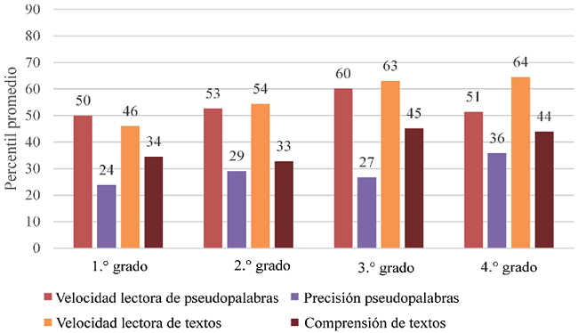 Como una forma de realizar una comparación directa entre la velocidad y la precisión en la lectura de pseudopalabras, en relación con las normas de la prueba LEE, la figura 1 presenta las puntuaciones percentiles para las cuatro variables.