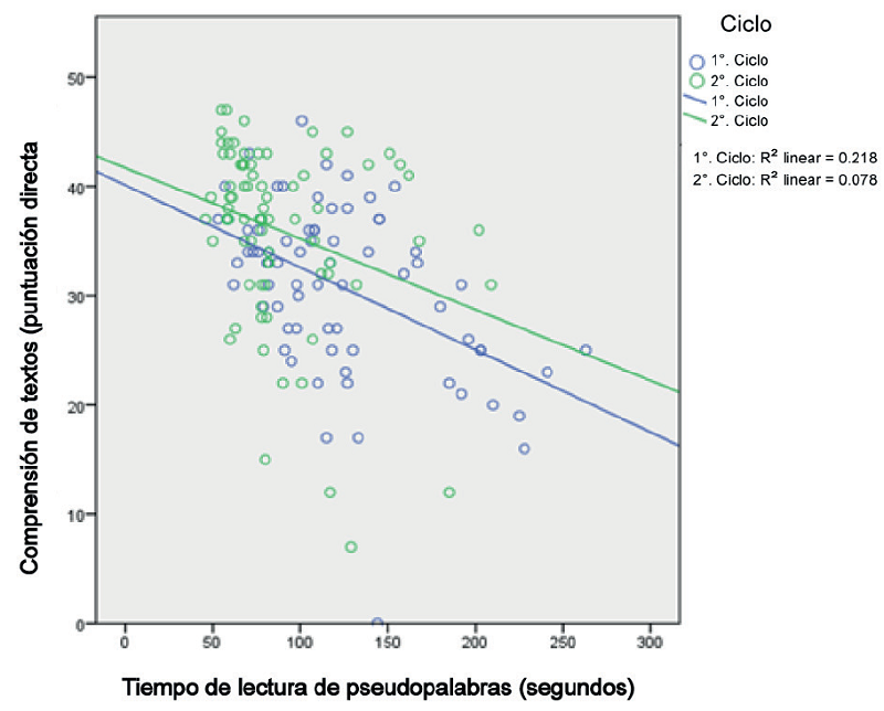 El segundo objetivo compara la relación entre la velocidad lectora de pseudopalabras y la com prensión lectora de textos regulares en el ciclo 1 versus el ciclo 2. Se plantea la hipótesis de que la velocidad lectora tendrá una asociación mayor con comprensión lectora en el ciclo 1 que en el ciclo 2, pues suponemos que, al inicio del proceso de adquisición de la lectura, los alumnos dependen más de la decodificación en su sentido más puro, en este caso, medido por las pseudopalabras para acceder al significado del texto.