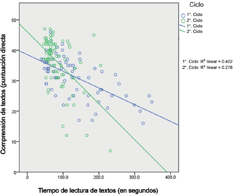 La figura 2 describe que la dispersión es menos pronunciada para el ciclo 1; en otras palabras, la línea constituye un mejor modelo para el ciclo 1. La figura, también, describe que es posible tener poca velocidad (tardarse muchos segundos) y buena comprensión lectora y que, además, resulta posible con tar con buena velocidad (tardarse poco) y no necesariamente poseer una buena comprensión lectora en ambos ciclos. R2