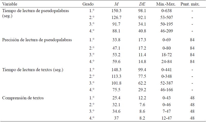 Los estadísticos descriptivos, para la muestra completa, se muestran, a continuación, para los resultados de las cuatro variables obtenidas por grado escolar. Se incluyen la media, la desviación es tándar y el rango (mínimo y máximo). Asimismo, se contabiliza el puntaje máximo en aciertos para las variables de precisión y de comprensión lectora. En la tabla 1 se muestran las cantidades en segundos para las dos variables de velocidad y las puntuaciones directas en aciertos para precisión de lectura de pseudopalabras y comprensión de textos.