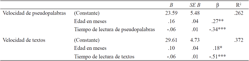 Finalmente, se realizó un análisis para la muestra de 1.° a 4.° grados para evaluar si la velocidad de lectura de textos (que es la más predictiva de acuerdo con los análisis anteriores) sigue siendo predictiva después de controlar por la precisión de la decodificación de pseudopalabras. Este séptimo análisis se muestra en la tabla 5.
