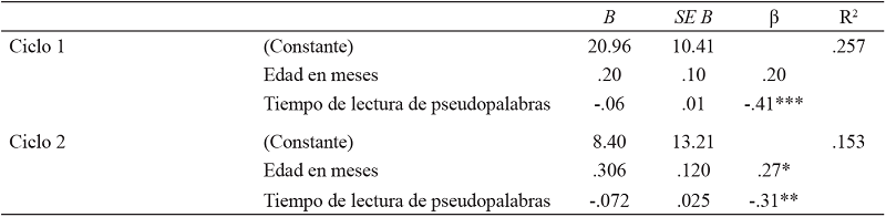El primer modelo de la tabla 3 muestra que la velocidad de pseudopalabras y la edad explican un 25.7% de la variabilidad de la comprensión lectora en el ciclo 1. Además, el segundo modelo de la Tabla 3 muestra que el mismo modelo aplicado al ciclo 2 solo explica 15.3% de la variabilidad en comprensión lectora. En ambos casos, los coeficientes de velocidad de lectura de pseudopalabras son significativos.