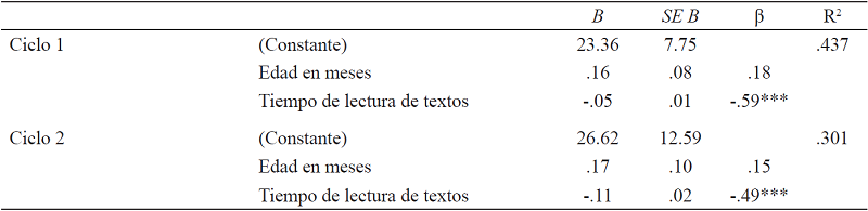 A continuación, se presentan los resultados de las regresiones lineales para predecir comprensión lectora a partir de la velocidad de dichos textos en la tabla 4 para los ciclos 1 y 2, respectivamente.