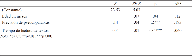 El primer modelo reportado, en la tabla 2, indica que el 26.2% de la varianza en comprensión lectora se puede explicar con el tiempo de lectura de pseudopalabras y la edad.