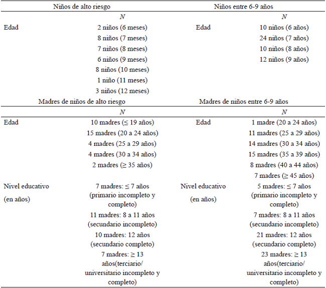 La muestra estuvo conformada por 35 bebés de alto riesgo, entre 6 y 12 meses de edad, que asistían a la Maternidad Provincial de San Luis. Se incluyeron infantes de ambos sexos. Se realizó un muestreo aleatorio simple con el propósito de definir el subconjunto de individuos sobre los que se efectuarían las mediciones durante el primer año de vida del bebé. Se seleccionó a estos infantes porque la posibilidad de aparición de alteraciones en el desarrollo es más elevada, especialmente si se asocia con el riesgo ambiental. Comprender el desarrollo del niño supone considerar, de manera interrelacionada, tanto los componentes biológicos, las relaciones tempranas, que junto a la confluencia de otros factores pueden dar lugar a determinados problemas en el desarrollo. Se definen como niños de alto riesgo, aquellos que, al momento de nacer, ya sea por circunstancias prenatales, como perinatales o posnatales, requieren cuidados especiales (permanencia en incubadora, asistencia respiratoria, intervenciones quirúrgicas, entre otros) indispensables para lograr su supervivencia así como para disminuir la posibilidad de aparición de dificultades en su desarrollo. Puede tratarse tanto de bebés que han nacido prematuros como de aquellos nacidos a término, pero que presentan alguna patología cardiovascular, pulmonar, renal, neurológica, genética, infecciosa que los hace más vulnerables que el resto de los recién nacidos (Dirección Nacional de Salud Materno Infantil, 2003; Nikodem, 2009).