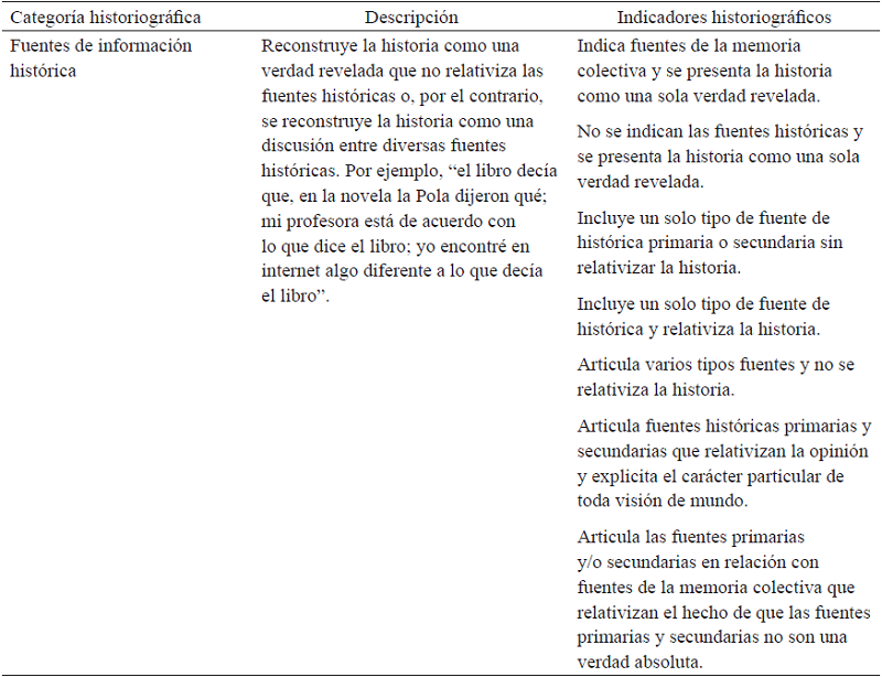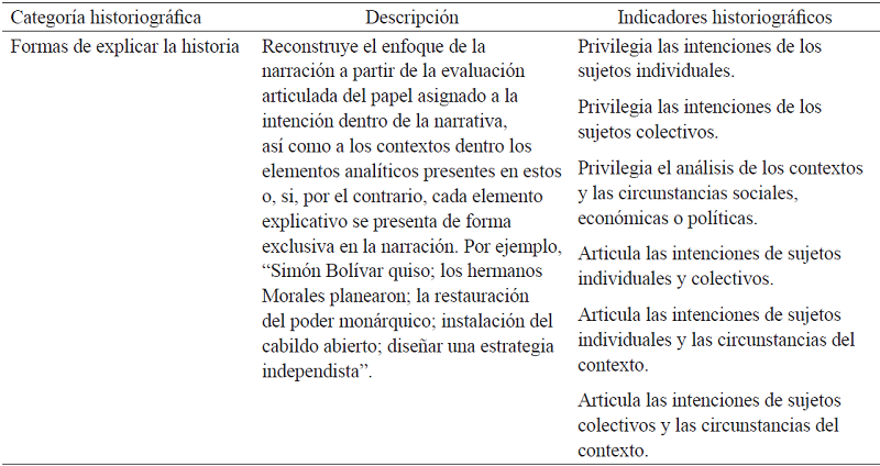 En segundo lugar, el análisis del contenido historiográfico en la narrativa solo puede comprenderse en el nivel holístico del discurso al reconstruir los elementos historiográficos que estructuraron el conocimiento histórico producido en la narrativa como un todo. Por esta razón, en este nivel, se partió de la narrativa (como unidad de análisis) para mapear cómo se reconstruyeron los indicadores historiográficos tales como el uso de fuentes primarias o de la memoria colectiva, la articulación de las intenciones de los protagonistas y los contextos políticos del pasado, entre otros. Para este estudio, se construyó una matriz de análisis que involucró seis variables historiográficas. La tabla 1 describe cada variable historiográfica, las cuales fueron rastreadas y codificadas en cada sección narrativa (i.e. resumen, orientación, complicación, evaluación, resolución y coda) a partir de indicadores historiográficos preestablecidos; además, se incluyeron aquellos indicadores que emergieron en el análisis de los datos.