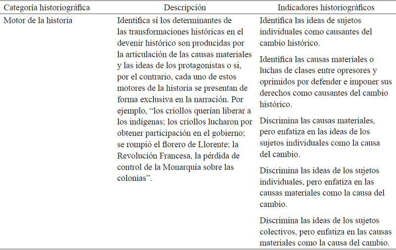 Adicionalmente al tipo de narrativa y la macroestructura de la narrativa (Labov & Waletzky, 1967; Labov y Waletzky, 1967/1997), se analizó el contenido historiográfico de la narración (Burke, 1993; Ricoeur, 1990; White, 1992, 1973/2001) para conocer los elementos que ofrecen mayor sofisticación disciplinar a la narración histórica. Se espera conocer cómo se transforma la construcción de la macroestructura de la narrativa y cómo, a través de ella, se traman de formas diferentes los elementos historiográficos (e.g., derivados de las intenciones de los sujetos y de las condiciones contextuales, de la unicausalidad y la multicausalidad).
