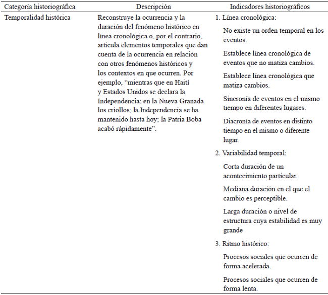 Existe una amplia tradición investigativa que, basada en enfoques cognitivos y constructivistas, privilegia el desarrollo del pensamiento histórico a través de la comprensión de elementos historiográficos tales como situar el hecho histórico en el tiempo, describir y explicar el hecho histórico, distinguir procesos de cambio y continuidad, considerar la confiabilidad de los recursos y soportar los puntos de vista con argumentos (Ashby, Lee, & Shemilt, 2005; van Drie & van Boxtel, 2008; van Drie, van Boxtel, Erkens, & Kanselaar, 2005). No obstante, al mismo tiempo, existe una amplia investigación sobre estrategias de intervención que generan efectos positivos sobre la comprensión historiográfica. Estos estudios indican diversas estrategias plausibles entre las que se encuentran escribir relatos históricos y reconstruir el por qué y cómo el autor escribió el texto histórico (McKeown & Beck, 1990; Rouet, Favart, Britt, & Perfetti, 1997), problematizar los relatos históricos (Bain, 2005), usar la retórica del historiador para que los estudiantes logren integrar los hechos históricos en las explicaciones escritas (Leinhardt & Young, 1996) y formular preguntas que orienten la historia disciplinar y la discusión grupal (Ashby, Lee, & Shemilt, 2005), entre otras.