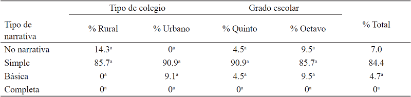 El análisis de las narrativas reveló que, de acuerdo con el sistema de clasificación de Labov y Waletzky (1967) y Labov (2004), la mayoría de los estudiantes se ubicaron en niveles inferiores de sofisticación (i.e. configuraron narrativas de tipo simple) y una proporción menor logró niveles intermedios de sofisticación (i.e. narrativa de tipo básico). La narrativa de tipo simple predominó sobre los demás tipos de narrativa con porcentajes más altos en las producciones de estudiantes de colegios urbanos y de quinto grado. Por su parte, pequeños subgrupos de estudiantes de colegios urbanos y ambos grados escolares produjeron narraciones de tipo básico que revisten un nivel de mayor sofisticación narrativa; pero, estos casos resultaron ser excepcionales. El análisis de tabla cruzada reflejó independencia entre el tipo narrativa y el tipo de colegio (c2 (2,43) = 5.085, p > .05), así como entre el tipo narrativa y el grado escolar (c2 (2,43) = 0.812, p > .05).