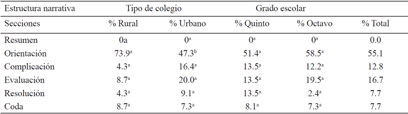 El análisis de tabla cruzada encontró que la estructura de las narrativas producidas por los estudiantes no difiere estadísticamente entre el tipo de colegio rural y urbano (c2 (4,78) = 5.675, p > .05). Sin embargo, a pesar que en el agregado de las distribuciones de secciones narrativas no existieron diferencias significativas entre los tipos de colegio, la prueba Bonferroni (α < .05) indicó diferencias en la distribución de la sección de orientación entre el tipo de colegio. Así, los estudiantes de colegios rurales se distribuyen con mayor porcentaje en la sección de orientación (rural: 73.9%; urbano: 47.3%), en comparación con los colegios urbanos.