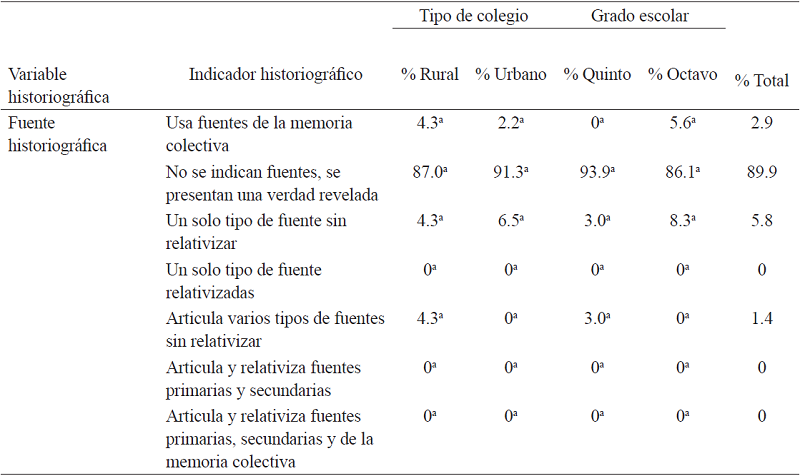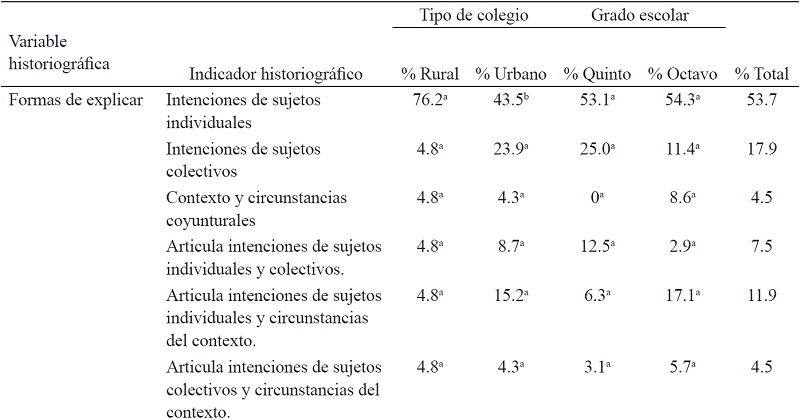 Con respecto al tipo de colegio, los estudiantes usaron regularmente los mismos indicadores historiográficos para narrar la historia, independientemente del tipo de colegio en el que estudian. En particular, el análisis de tabla cruzada reveló que no existen diferencias estadísticamente significativas entre las narraciones de los estudiantes de colegios rurales y urbanos con respecto al uso de fuentes historiográficas (c2 (3,69) = 2.407, p > .05), formas de explicar (c2 (5,67) = 7.454, p > .05), motor de la historia (c2 (3,42) = 6.825, p > .05), construcción de la línea temporal (c2 (3,66) = 1.468, p > .05), variabilidad temporal (c2 (2,66) = 5.124, p > .05), ni ritmo histórico (c2 (3,60) = 1.983, p > .05) (ver tabla 4) .