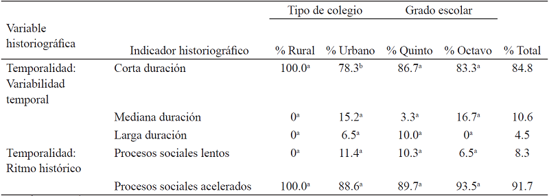 En la tabla 4 se observa que el patrón general en las narraciones de los estudiantes indica que, en ambos tipos de colegios y grados escolares, las producciones narrativas privilegiaron indicadores historiográficos tales como el no uso de fuentes históricas para reconstruir la historia, en el 89.9% de los casos, así como explicar la historia basados en las intenciones de sujetos históricos individuales, en el 53.7% de los casos. Además, los estudiantes en sus producciones narrativas privilegiaron las ideas de los protagonistas de la historia como motor del cambio del histórico, en el 66.7% de los casos. Por su parte, con respecto a la construcción de la temporalidad histórica, el 71.2% de los casos privilegió la ordenación cronológica de los eventos sin matizar los cambios históricos entre ellos, el 84.4% de los casos reconstruyó la historia como un acontecimiento de corta duración y el 91.5%, como un proceso social acelerado.