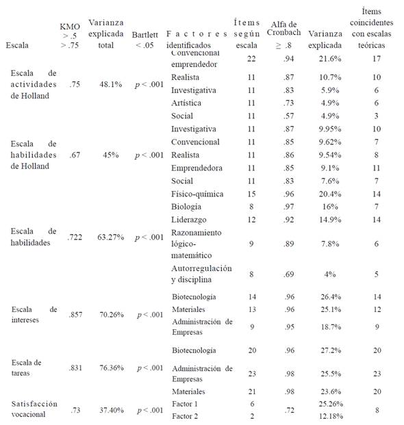 Las preferencias vocacionales se definieron a partir de las puntuaciones de las tareas e intereses en tres áreas: Ingeniería en Materiales, Administración de Empresas e Ingeniería en Biotecnología. Para las habilidades se planteó la existencia de seis factores: matemática, física, biológica, químicas, liderazgo y autorregulación-disciplina.