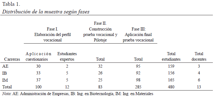 Se contó con tres submuestras, una para cada fase de recolección de datos: 1. fase de construcción del perfil vocacional, 2. Fase de elaboración del instrumento vocacional y pilotaje y 3. Aplicación final del instrumento.
