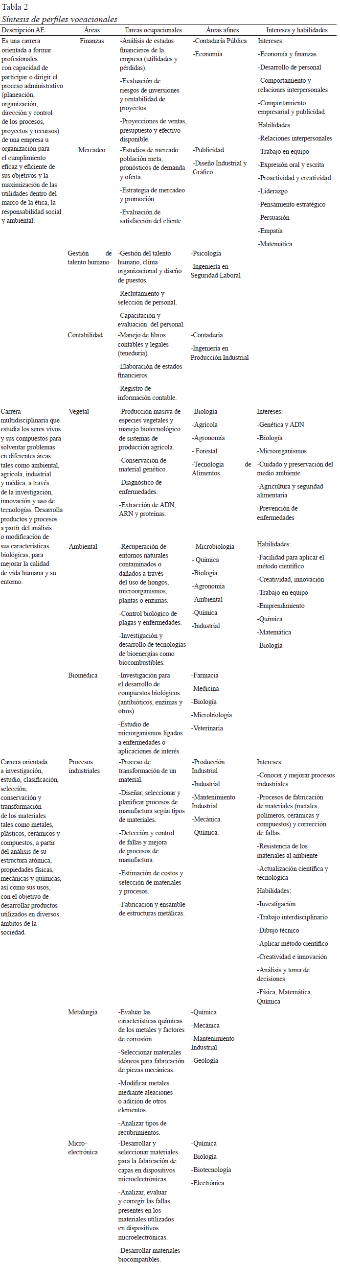Se elaboró el perfil vocacional que se resume en la tabla 2. Se describen las principales características de las áreas de Administración de Empresas, Materiales y Biotecnología. Se consideran definición, tareas ocupacionales, intereses y habilidades.