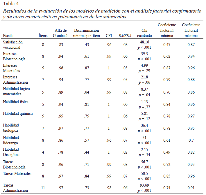 Por su parte, los resultados del análisis factorial confirmatorio de la fase final de aplicación del instrumento Tareas, intereses y habilidades se presentan en la tabla 4, en la cual se indica el número total de ítems de cada escala y los coeficientes de confiabilidad, que oscilaron entre .74 y .95. También, se reporta el valor mínimo de discriminación por ítem (según teoría clásica de los test), que en todos los casos fue superior a .4.
